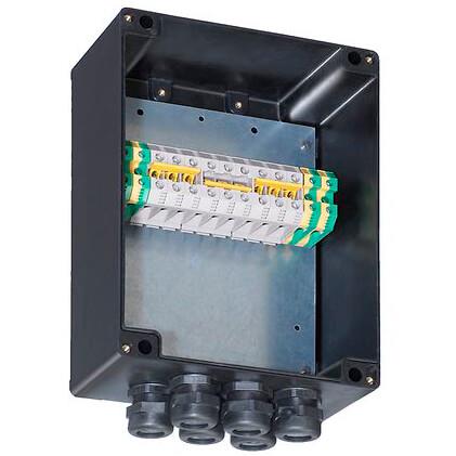 Brand: AppletonAppleton™ increased safety ATX™ JBEP Series fiberglass reinforced polyester terminal junction boxes for electrical and power applications are factory drilled and equipped. They are ideal for lighting and distribution applications in Zone 1 and 2, 21 and 22. These enclosures feature pillar (live mantle clamping), miniature or screw terminals for use with armored and un-armored cable. The JBEP Series of power junction boxes are designed for motor and power distribution applications in Zone 1 and 2, 21 and 22. These enclosures can be supplied with 16sqmm to 240sqmm terminals in multiple configurations for use with armored and un-armored cables.