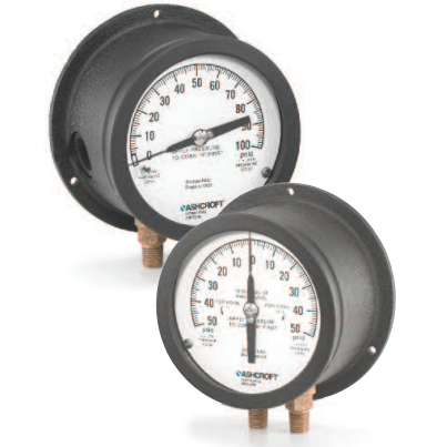 The Ashcroft Type 1125/1125A differential pressure gauges display the difference of two separate indicators. The 1125A is offered with “0” at the 12 o’clock position on the dial with positive pressure on either side of zero. The 1125/1125A has bronze Bourdon tubes with brass sockets.