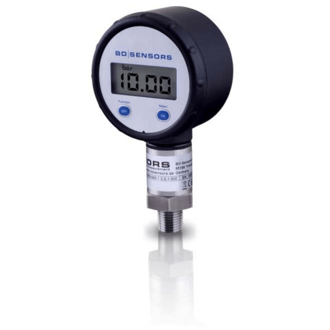 Brand: BD SensorsThe compact digital pressure gauge DM10 is battery-powered and has an adjustable housing; it is thus extremely suitable for mobile pressure monitoring. The 4.5-digit LCD indicates the battery status, the measurement value as well as the unit, this enables a fast and precise reading. It is possible to switch between the most common units (bar, psi, Pa, MPa). Additional functions as auto-zero, minimum / maximum values and an automatic switching-off complete the DM10 profile.